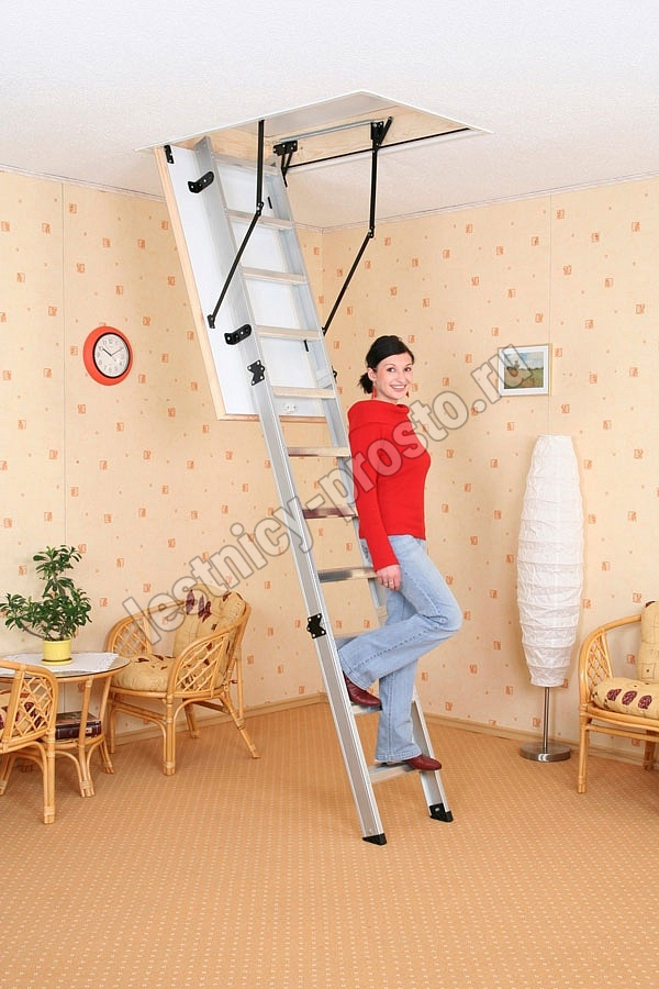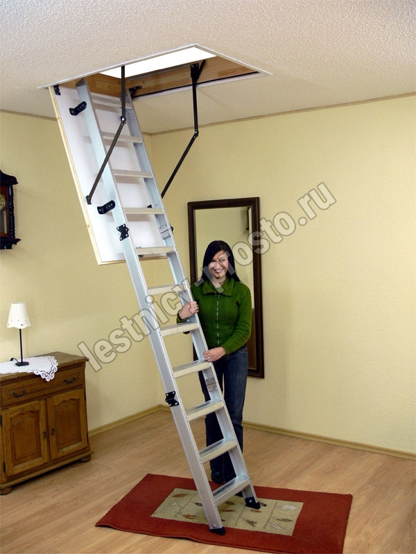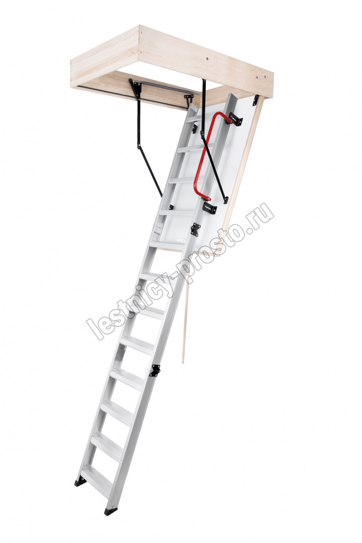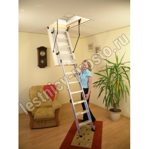 Лестница складная трехсекционная. Модель ALU PROFI идеальна для условий, когда чердак плохо утеплен и требует дополнительной теплоизоляции. Отличительной чертой лестницы ALUPROFI является легкая и чрезвычайно прочная лестница из алюминия высочайшего качества. Лестницы имеют нескользящие ножки, которые идеально прилегают к земле, предотвращают появление царапин на поверхности пола и придают лестнице эстетичный вид после ее резки.