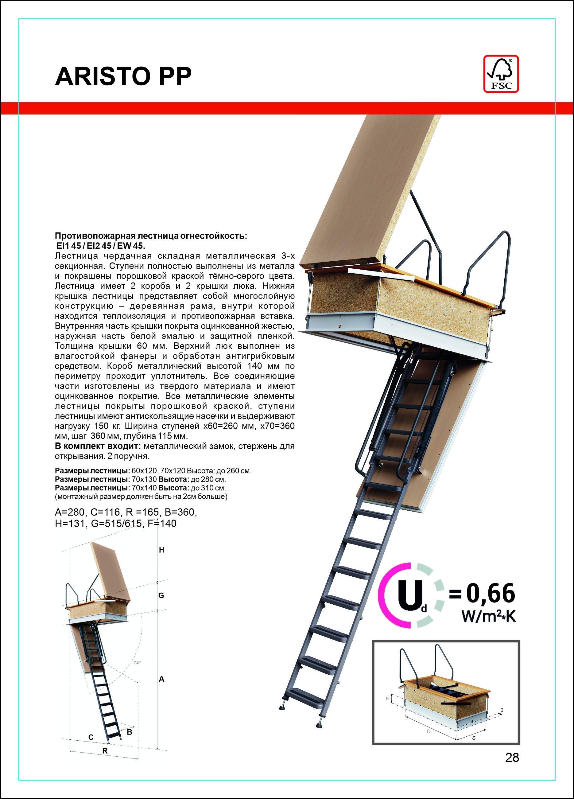 Лестница складная трехсекционная. Рабочая поверхность полностью выполнена из металла и покрашена порошковой краской. Термоизоляционная крышка типа "сэндвич", толщиной 86 мм, утеплена пенопластом, облицована с двух сторон ДCП белого цвета.