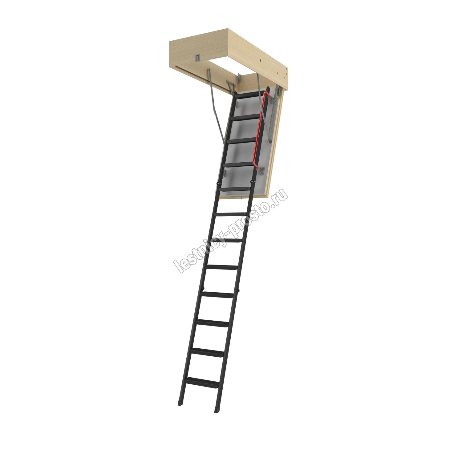 Лестничный марш выполнен из металла, покрытого порошковой краской, на ступенях сделаны специальные противоскользящие насечки. Для максимального комфорта и безопасности подъема лестница оснащена боковым металлическим поручнем красного цвета. Для правильного и быстрого монтажа рекомендуется дополнительно приобретать монтажный комплект LXK.