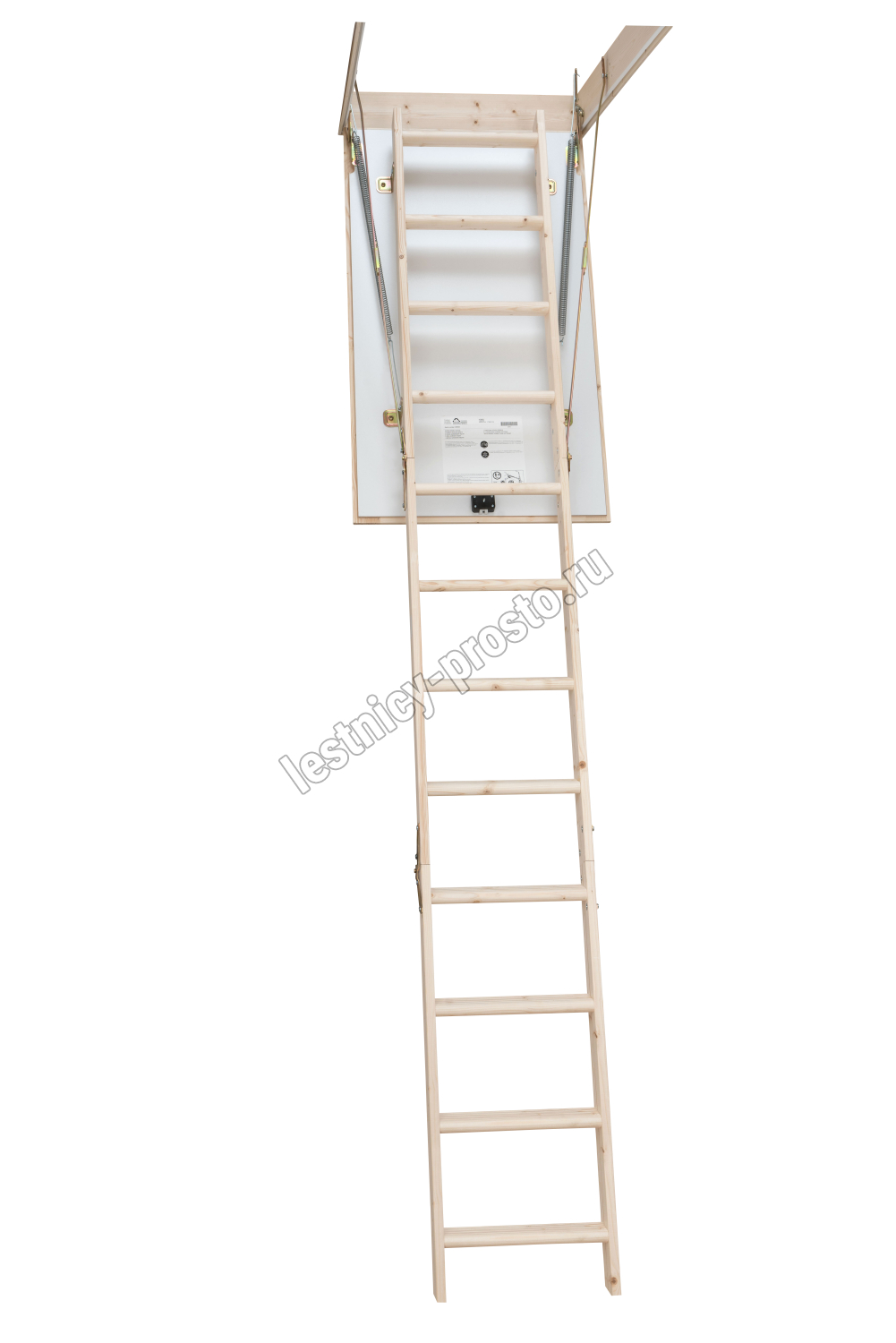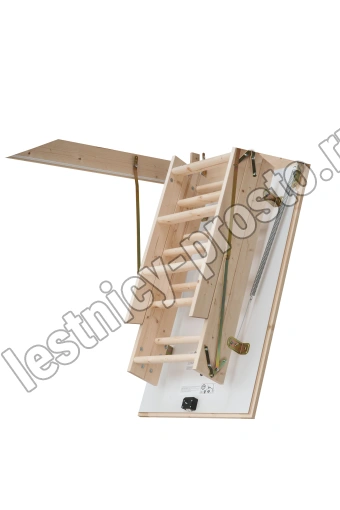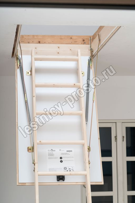 В комплекте: люк из сэндвич-панели, пружинный механизм "короб-люк", короб, трехсекционная лестница с сосновыми ступенями, замок люка, штанга для раскладывания лестницы.