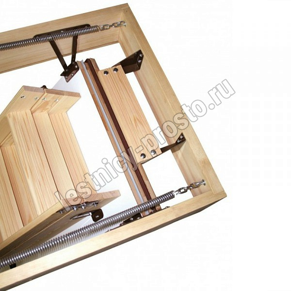 Максимально утеплённая чердачная лестница из массива сосны высокого качества. Складная, трёхсекционная (до 280 см) или четырехсекционная (до 335 см).