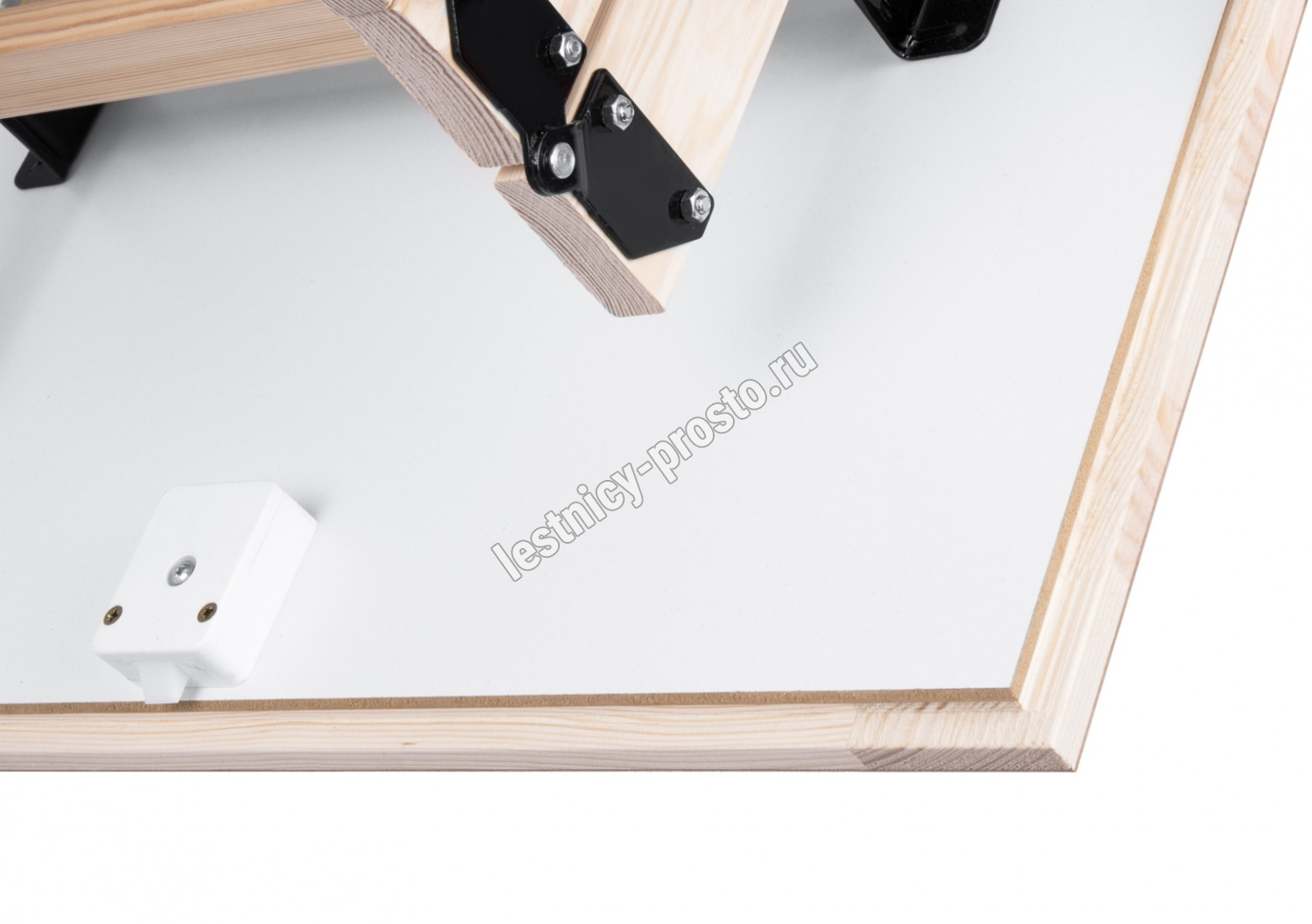 Лестница складная четырехсекционная, изготовлена из массива сосны. Термоизоляционная крышка типа "сэндвич" утеплена пенопластом толщиной 20 мм, облицована с двух сторон ДСП белого цвета.