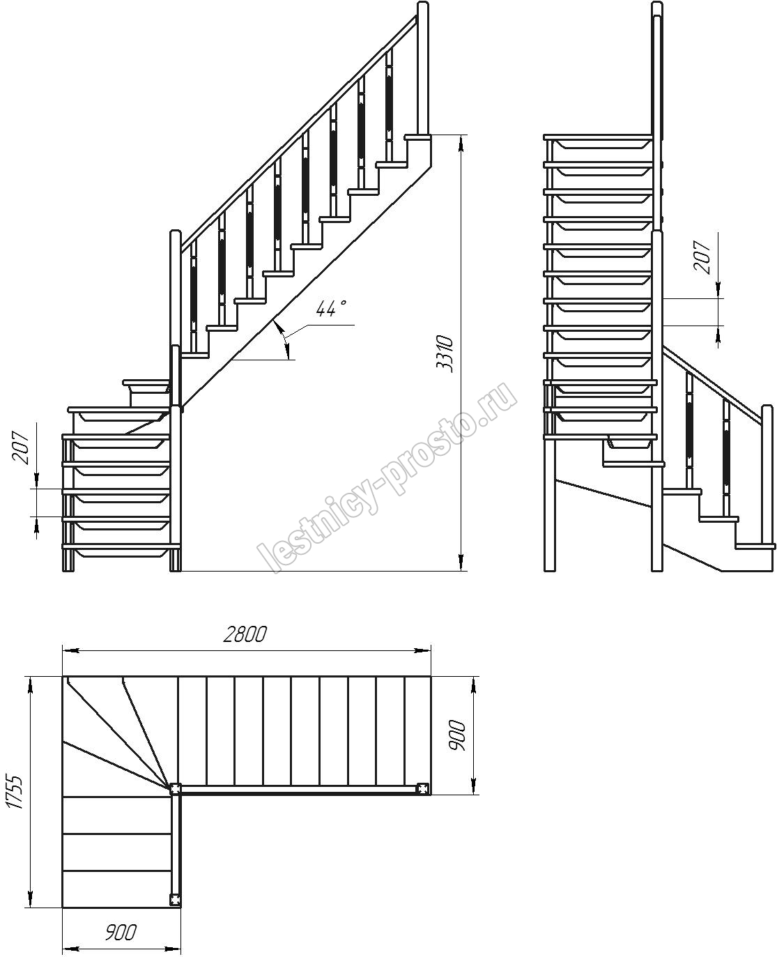 Деревянная межэтажная лестница ЛЕС-09 3310 проем 2800-900, Сосна