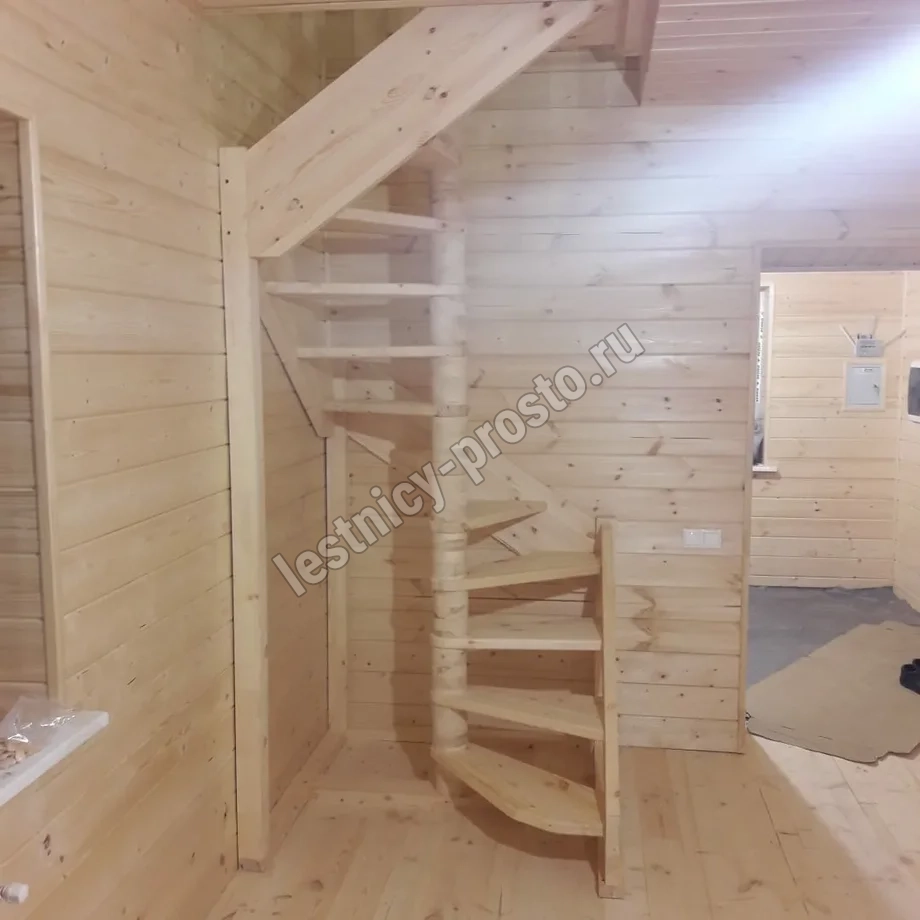 Небольшая аккуратная лестница, хорошо подойдет для помещения с небольшим проемом, поможет сэкономить пространство и организовать комфортный подъем на уровень выше. Возможны варианты лестницы из сосны под покраску, сосны, дуба, бука или ясеня. Для увеличения срока эксплуатации мы рекомендуем покрыть элементы лестницы защитным средством. Вы можете сделать это самостоятельно или заказать предварительное покрытие необходимым средством (или тонирование) в нашем цеху.