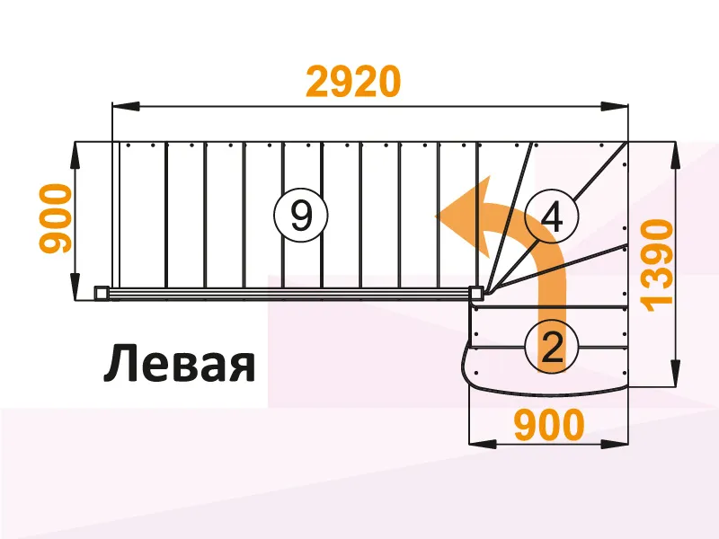 Поворот лестницы на 90 градусов выполнен через 4 забежные ступени. Первая (снизу) ступень - пригласительная, имеет скругленные внешние углы.