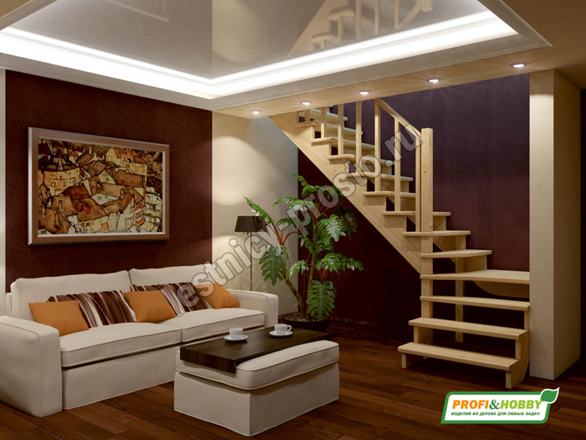 Ступени и поручень лестницы выполнены из бука, остальные элементы из сосны. Возможно изготовление данной модели полностью из бука. Базовый комплект включает в себя деревянные элементы лестницы и ограждения без какого-либо покрытия.