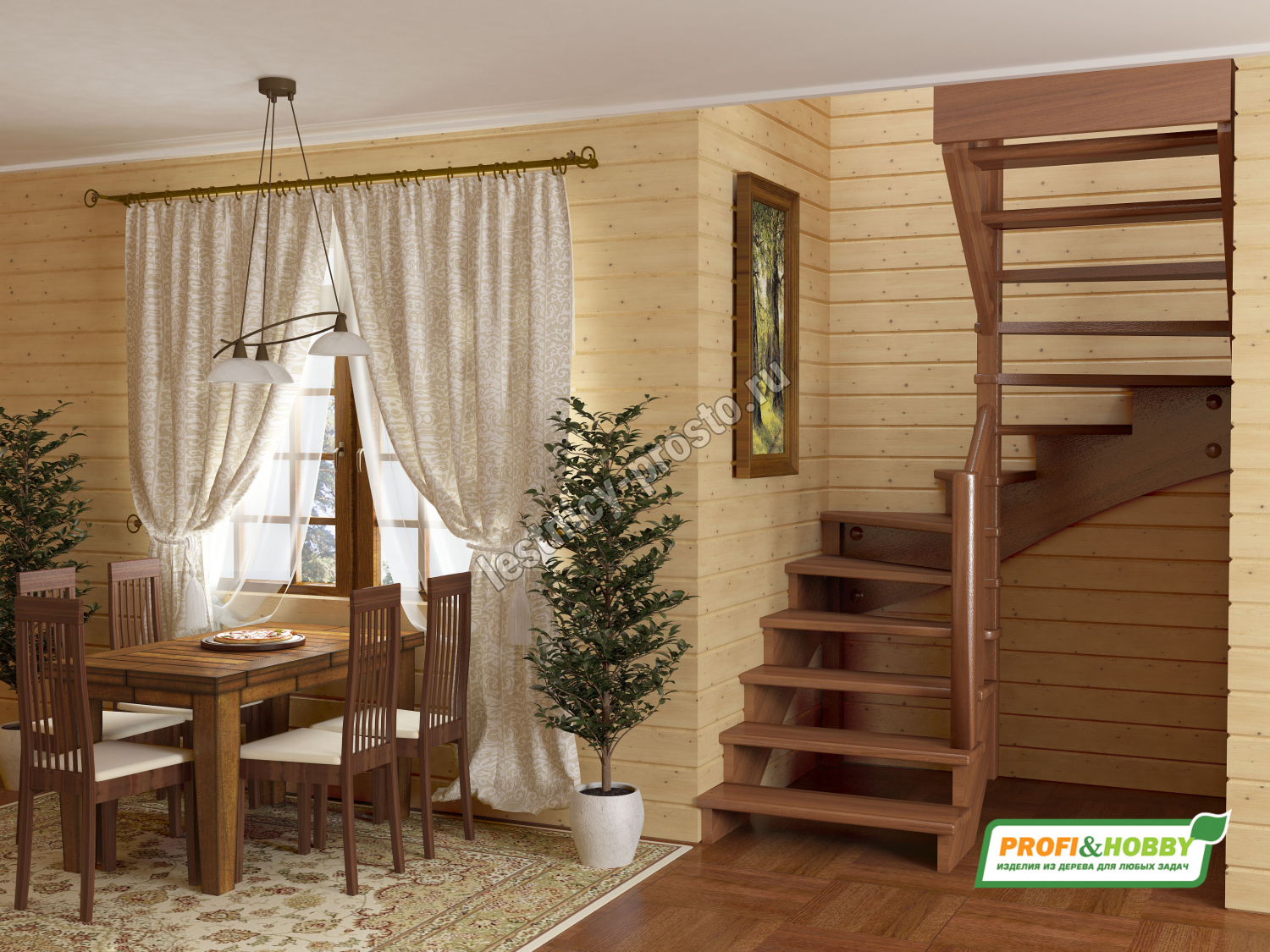 Ступени и поручень лестницы изготовлены из дуба, остальные элементы из сосны.