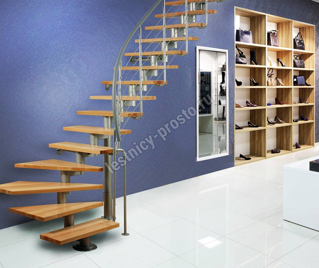Есть возможность регулировать высоту ступеней. В комплект входят перила с вертикальными стойками и горизонтальными перегородками.