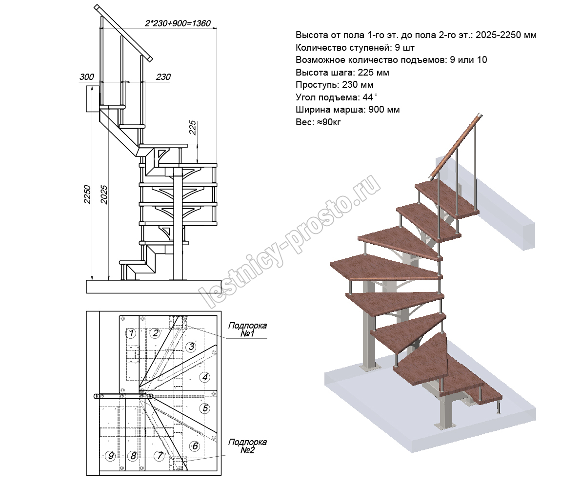 | Лестница PROSTO MONO П-образная, h225 см, ступени хвоя |