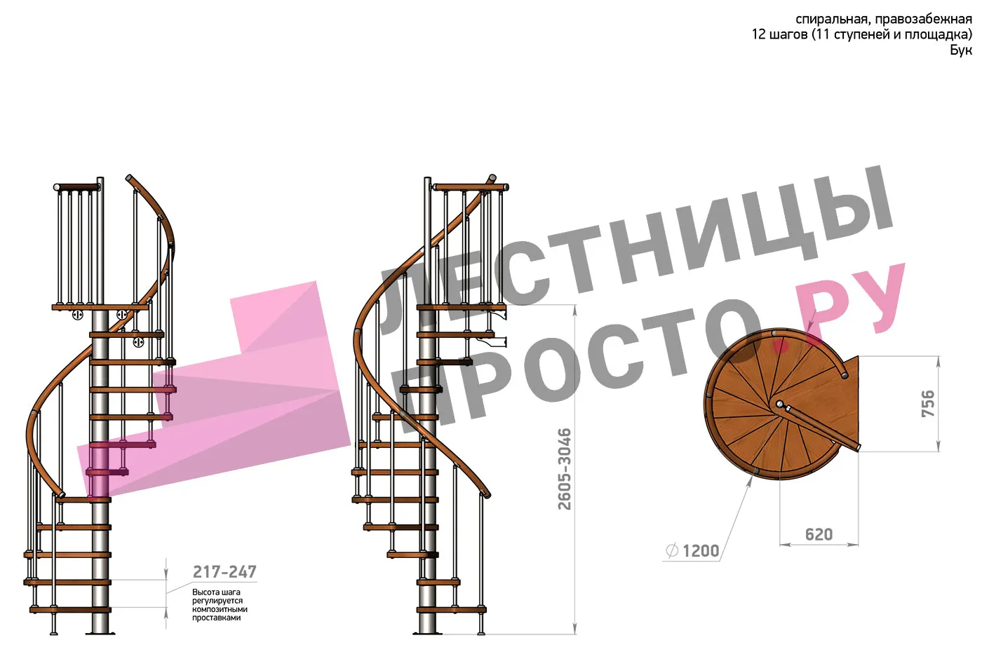Правая, d=120см, 12 ступеней + площадка