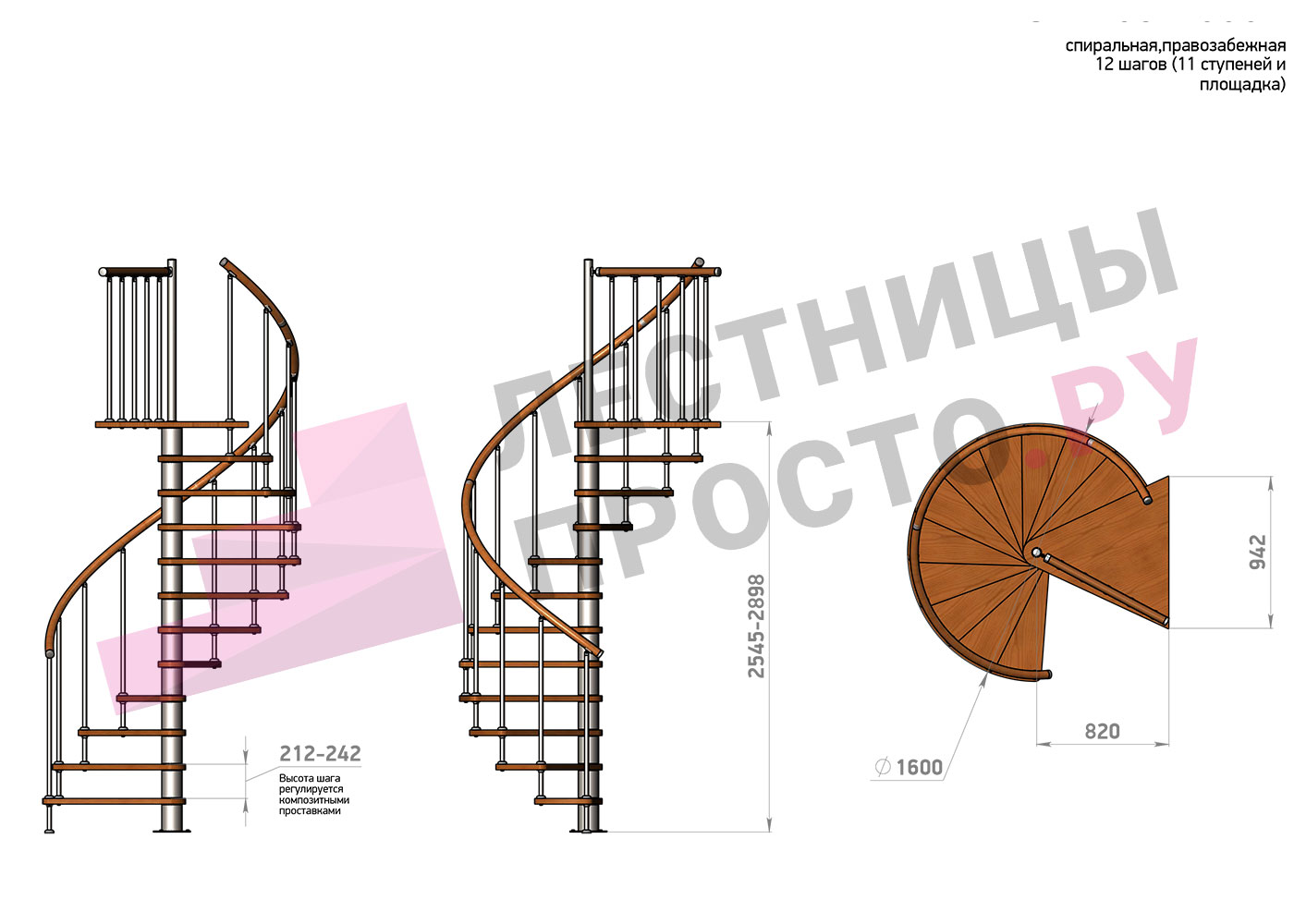 Высота ступеней регулируется с шагом 3 мм. в пределах 212-242 мм., благодаря чему, лестница прекрасно подгоняется под необходимую высоту.