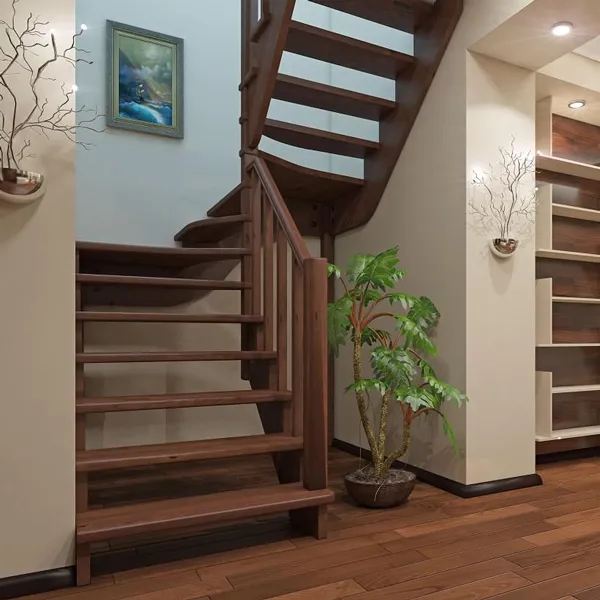 Ступени лестницы изготовлены из бука по технологии MULTIPLEX и покрыты износостойким защитным лаком. Лестница монтируется как по часовой стрелке, так и против. Возможен монтаж в круглый или квадратный проём. Ограждение: стальные трубки, Ø25 мм RAL 9006. Поручень: гибкий цельный ПВХ-поручень Ø40 мм серого цвета. Конструкция и балюстрада окрашены порошковым способом в серый цвет (RAL 9006).